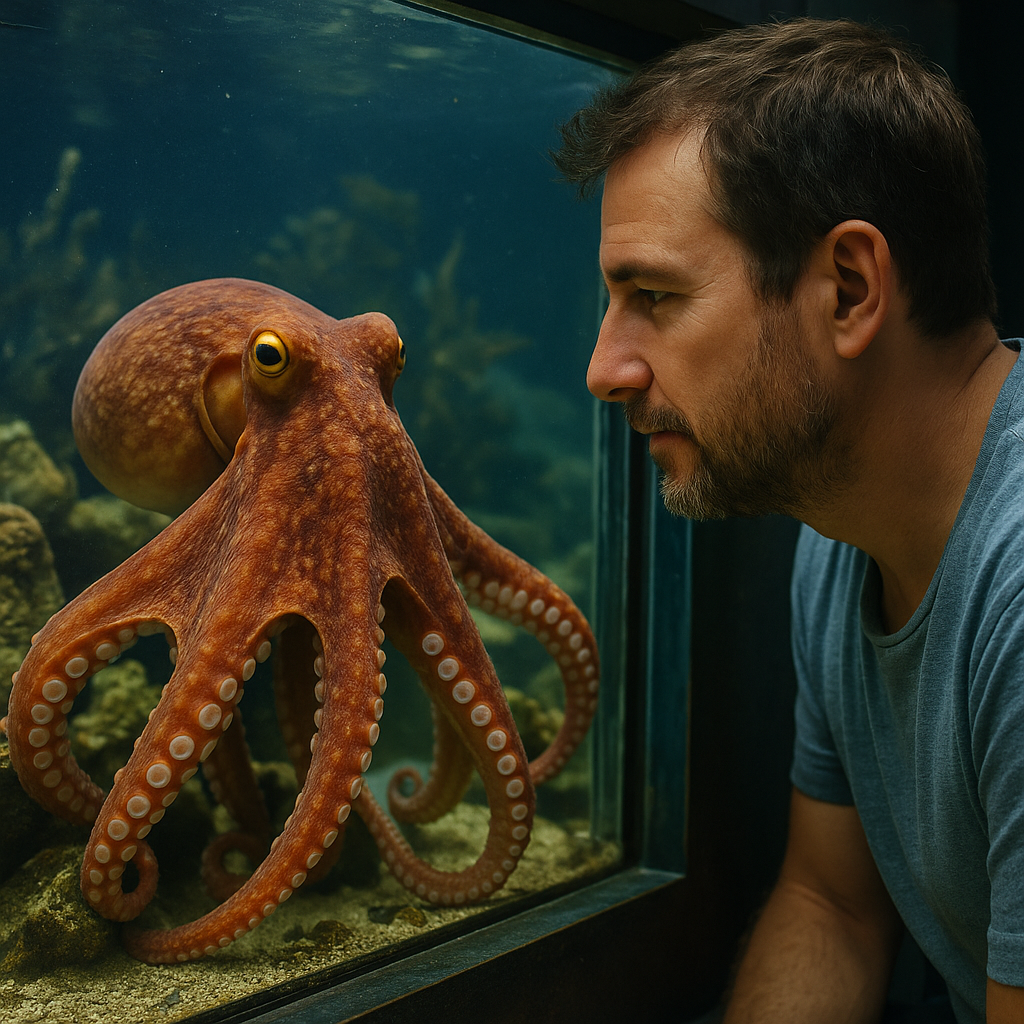 Lo que más me impresionó fue cuando describió la inteligencia del bicho: “¿Sabíais que un pulpo tiene un cerebro gigantesco y, además, pequeños centros de decisión en cada brazo? —explicaba con los ojos brillando—. Yo le hablo, le pongo música clásica y a veces parece que mueve los tentáculos siguiendo el ritmo”. Nos mostró un par de fotos en la pantalla: en una, Neptuno estiraba un tentáculo hacia la cámara; en otra, había abierto un pequeño frasco de vidrio para sacar su propia comida.